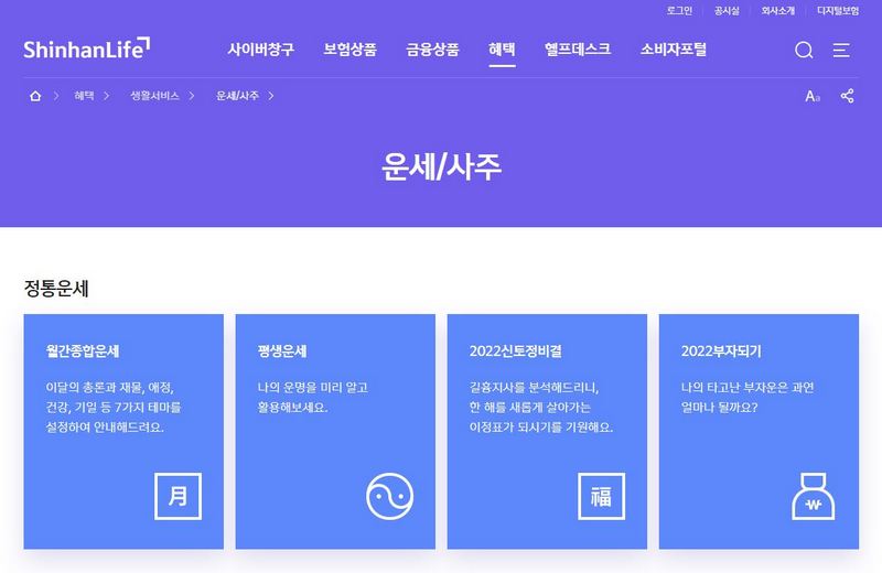 신한은행 모바일 애플리케이션(앱)이나 신한생명 홈페이지에 접속하면 혜택> 생활서비스> 운세/사주 카테고리를 눌러 본인의 운세를 무료로 확인할 수 있습니다.