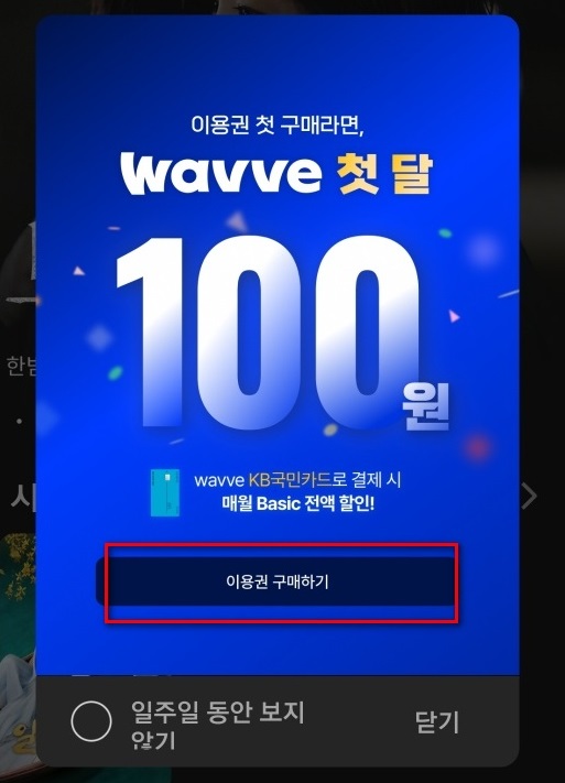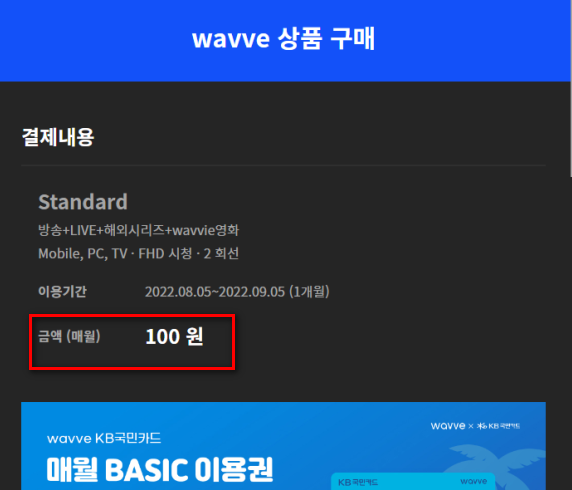 wavve(웨이브) 이용권 첫 구매라면, 첫 달 100원 문구가 뜹니다. 100원에 이용권을 구매해 보겠습니다.