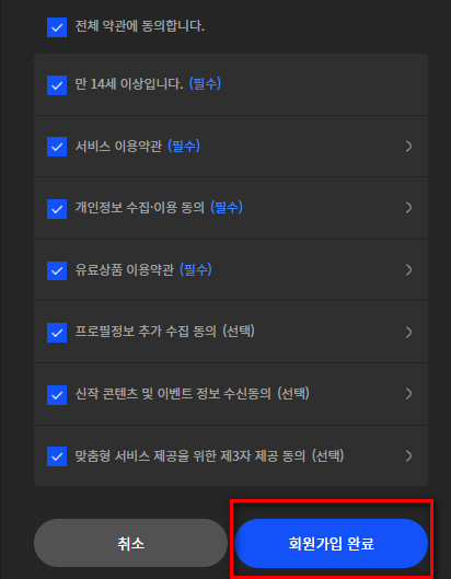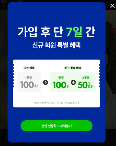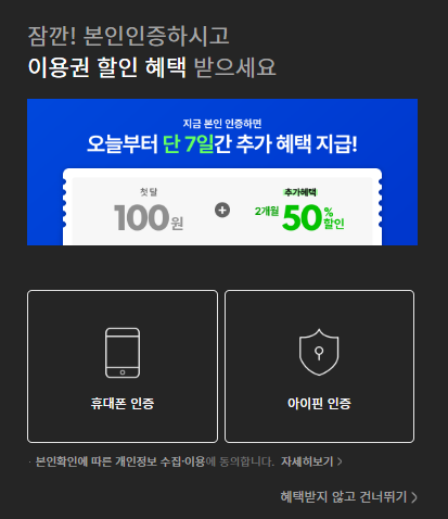 전체 동의 후 회원가입 완료 > 추가로 본인인증 시 첫 달 100원 + 2개월 50% 추가혜택이 있으니 3달 동안은 저렴하게 보실 수 있습니다.