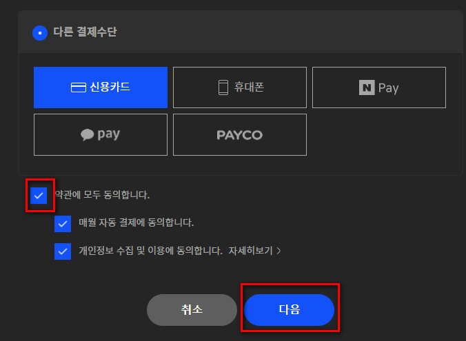 결제수단 선택 > 약관에 동의 > 다음 누르고 결제 완료하시며 100원 결제가 됩니다!