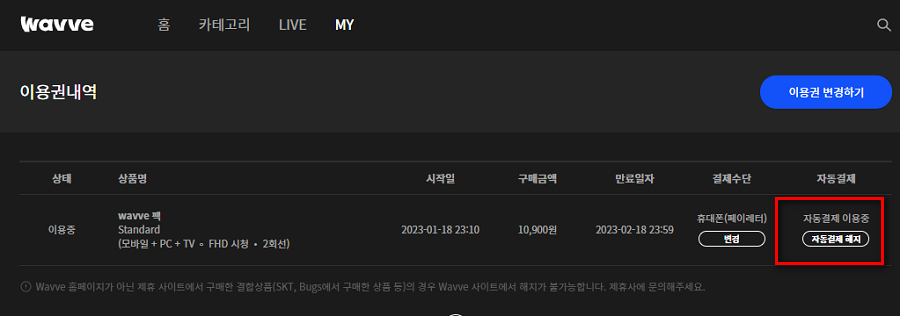 홈에서 MY > 이용 중 이용권 클릭 > 자동결제해지