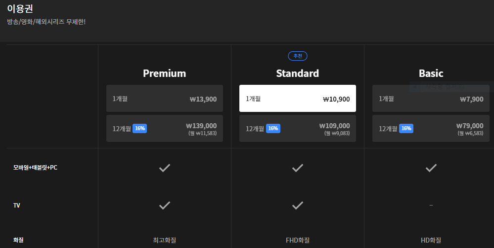 이용권 구매하기 누르시면 wavve(웨이브)의 요금제 3가지(Basic, Standard, Premium)가 뜨는데 tv시청가능, 화질, 동시시청에 따라